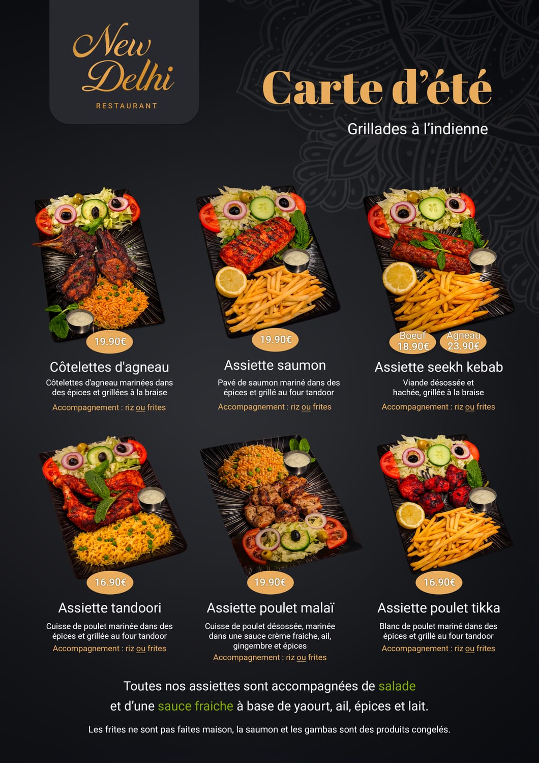 La carte d'été, c'est une gamme d'assiettes légères idéales à déguster par beau temps : salades généreuses et compositions fraîches qui marient viande, herbes et sauces maison. Des plats pensés pour la terrasse, sans alourdir la digestion, avec toujours ce supplément d'âme que confèrent les épices indiennes.