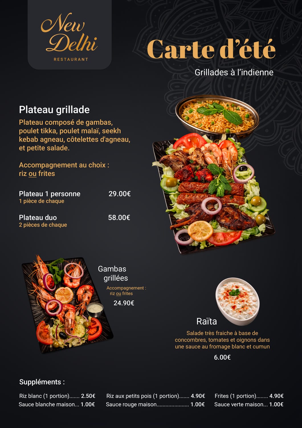 La carte d'été du New Delhi est disponible dès maintenant. Pour profiter de la terrasse et des meilleures grillades à Perpignan cette saison, pensez à réserver votre table à l'avance, les places sont limitées et les beaux jours se partagent vite.
